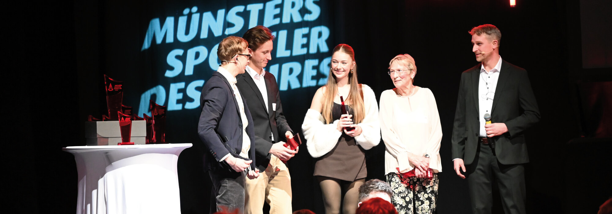 Die Preisträger/-innen für das Jahr 2024: Juliane Schlechter, Mareike Borgers und Christoph Möring (v.r.n.l.) sowie die Moderatoren Jonas Austermann und Thomas Rellmann (re.) von der Sportredaktion der Westfälischen Nachrichten.